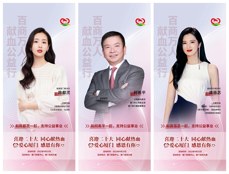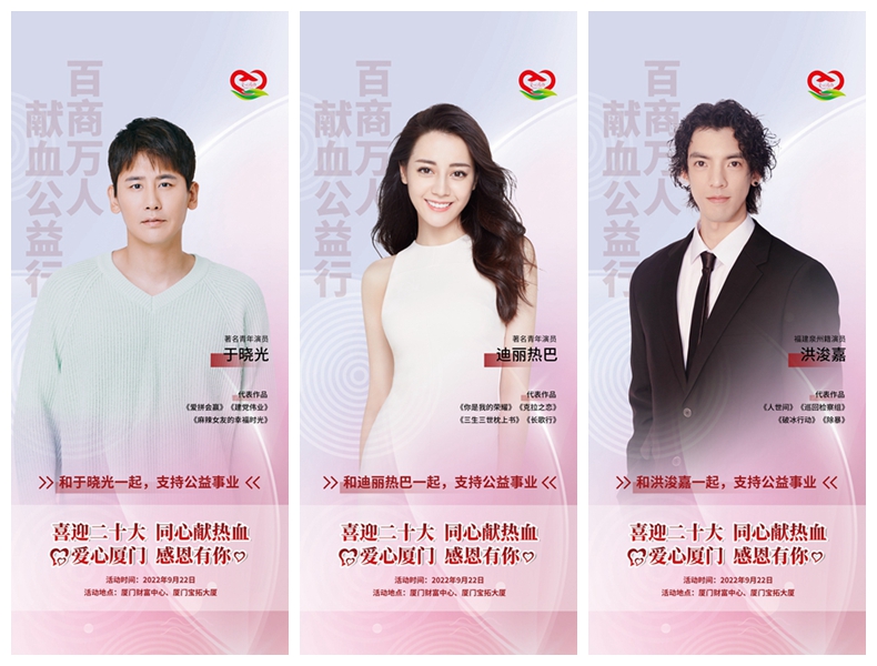 【廈門(mén)晚報(bào)】9月22日,由市工商聯(lián)(總商會(huì))發(fā)起,并聯(lián)合廈門(mén)市中心血站、廈門(mén)恒興集團(tuán)主辦的“百商萬(wàn)人獻(xiàn)血公益行”活動(dòng),將在廈門(mén)財(cái)富中心和寶拓大廈同時(shí)舉辦。近日,迪麗熱巴、陳都靈、龔蓓苾、洪浚嘉、于曉光等影視演員紛紛為廈門(mén)這一公益活動(dòng)發(fā)聲,拍攝視頻送上祝福,傳遞“愛(ài)心廈門(mén) 感恩有你”的正能量,號(hào)召愛(ài)心志愿者們助力廈門(mén)無(wú)償獻(xiàn)血公益事業(yè)。